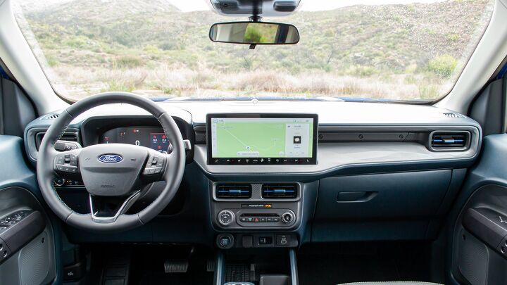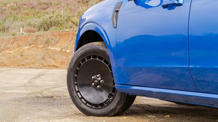 In addition to the distinctive L-shaped headlamps found across the entire '25 Maverick lineup, the Lobo boasts several exclusive enhancements to distinguish itself. It sports an individualistic lower front bumper that provides the robust look befitting a high-performance vehicle. The glossy-black grille showcases 30 slats along with a matching monochrome Ford emblem. Arguably the most striking element is the pair of 19-inch turbine-inspired wheels—a clear reference to the 2022 SEMA concept car that inspired the notion of a sporty pickup version of the Maverick. Too bad these wheels aren’t painted another color to highlight their intricate design even more.